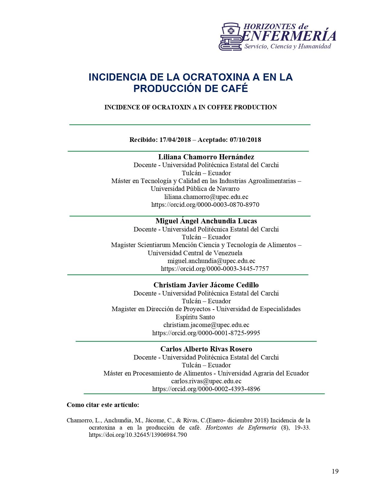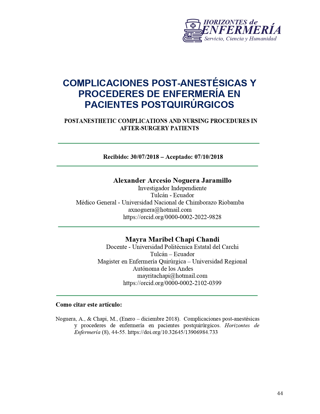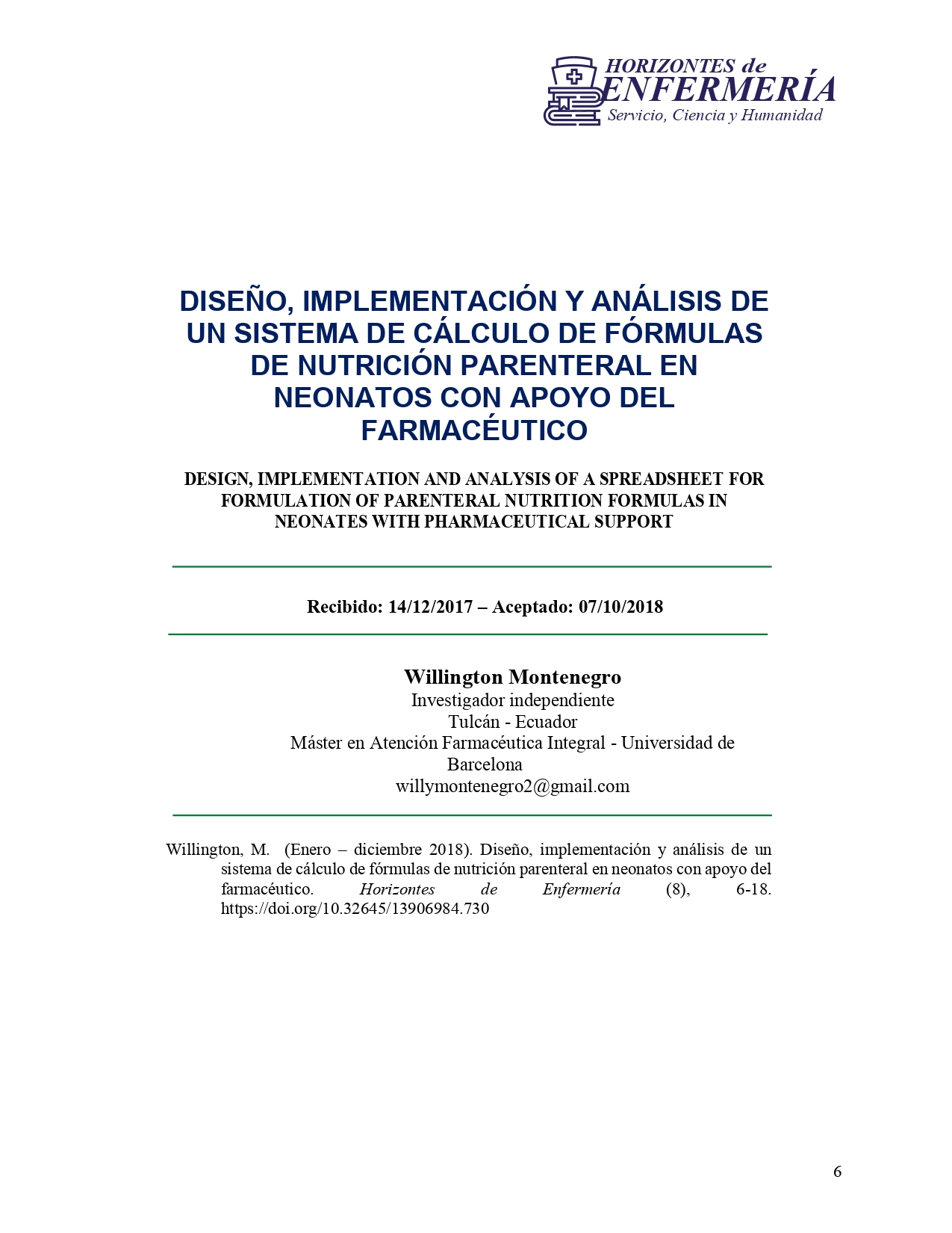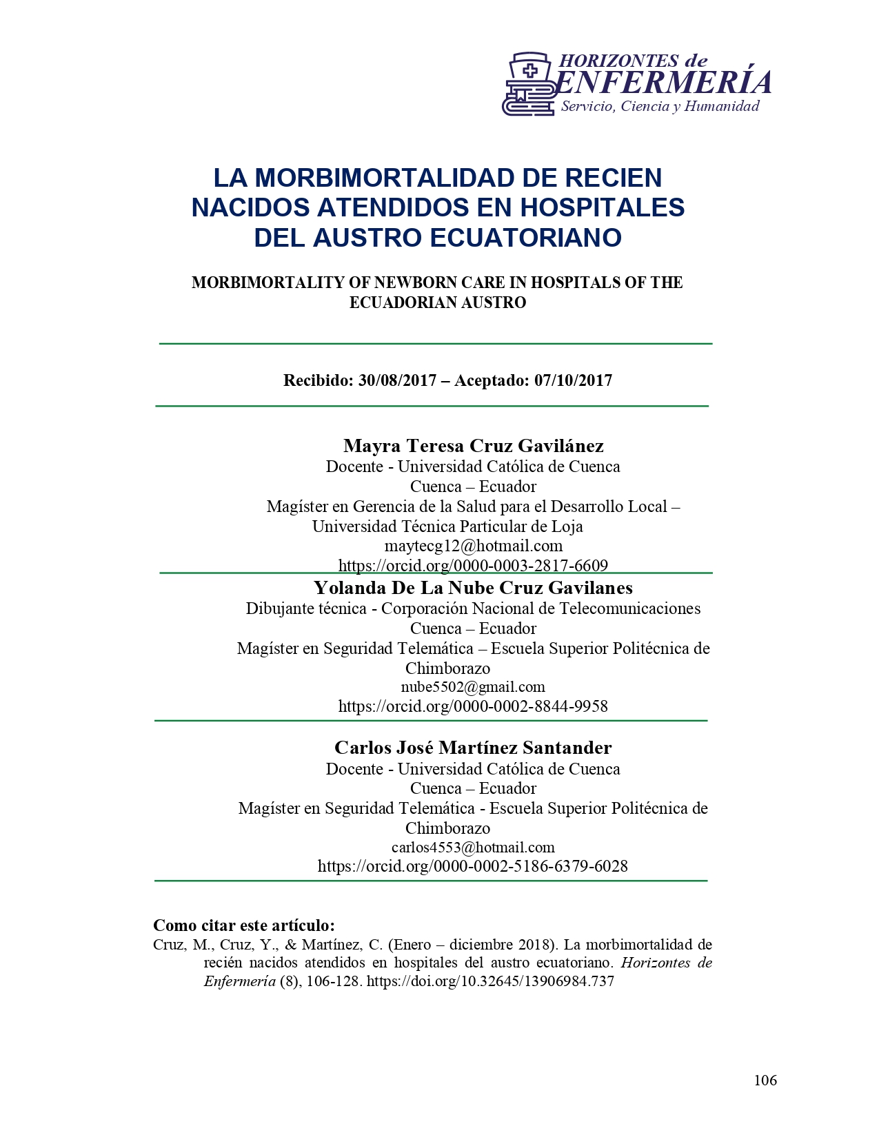 HORIZONTES DE ENFERMERÍA publica resultados de investigaciones realizadas por los docentes de la carrera de enfermería, de otras carreras y de profesionales en salud similares, foros, congresos, simposios, seminarios y artículos de vinculación con la colectividad bajo la responsabilidad de sus autores. Los artículos solo pueden ser reproducidos citando la fuente