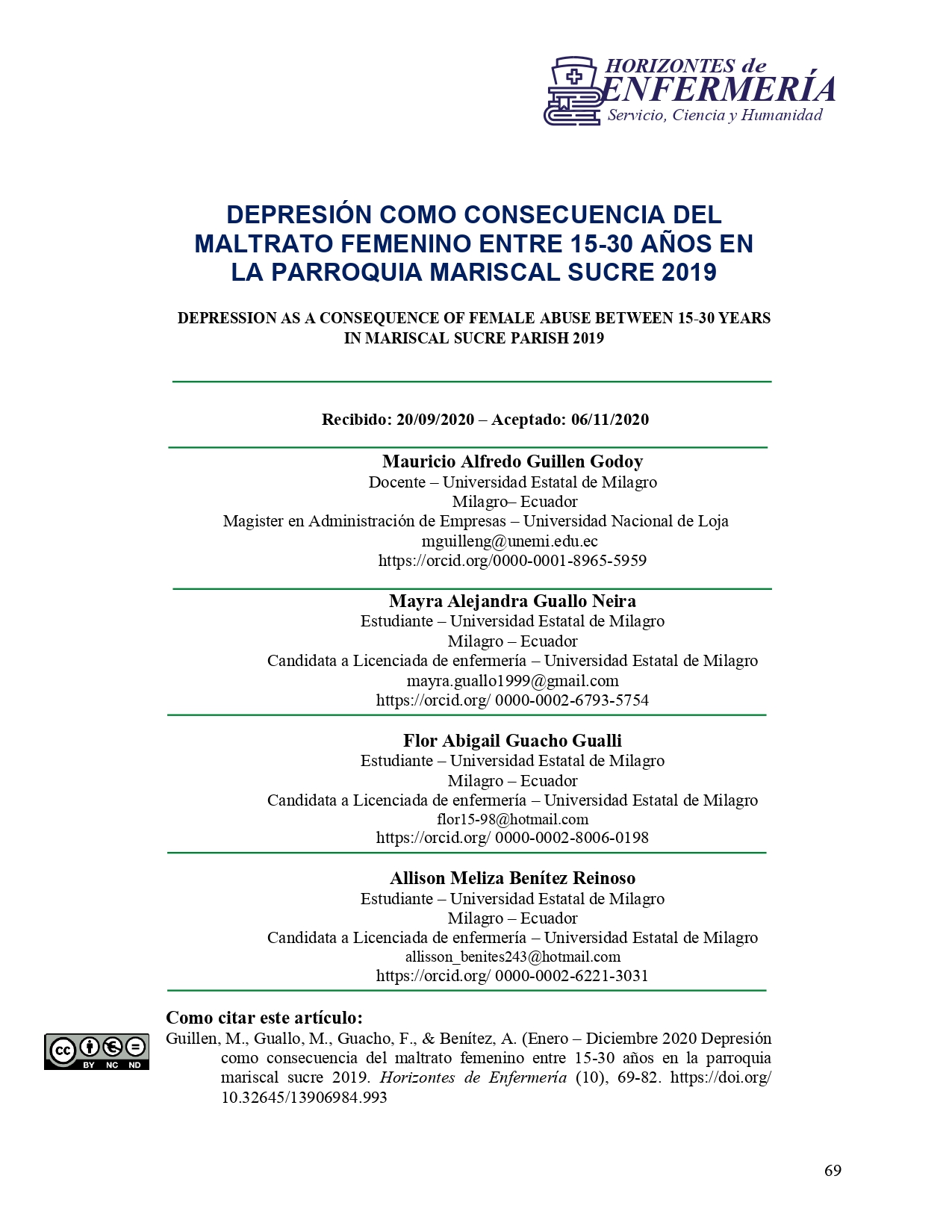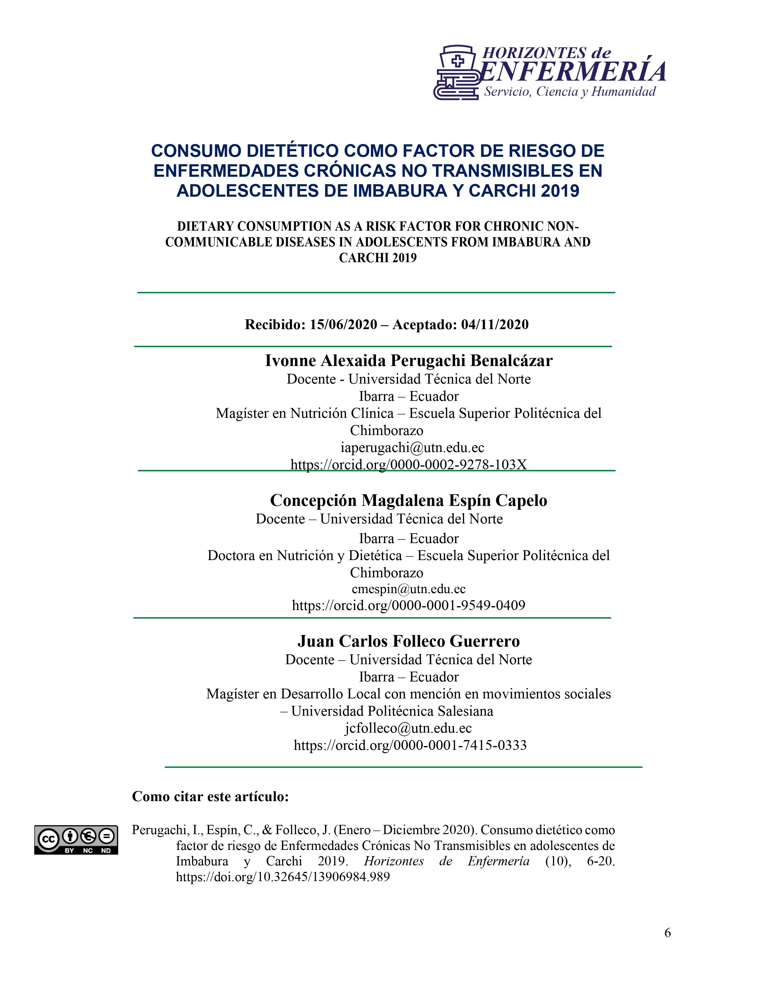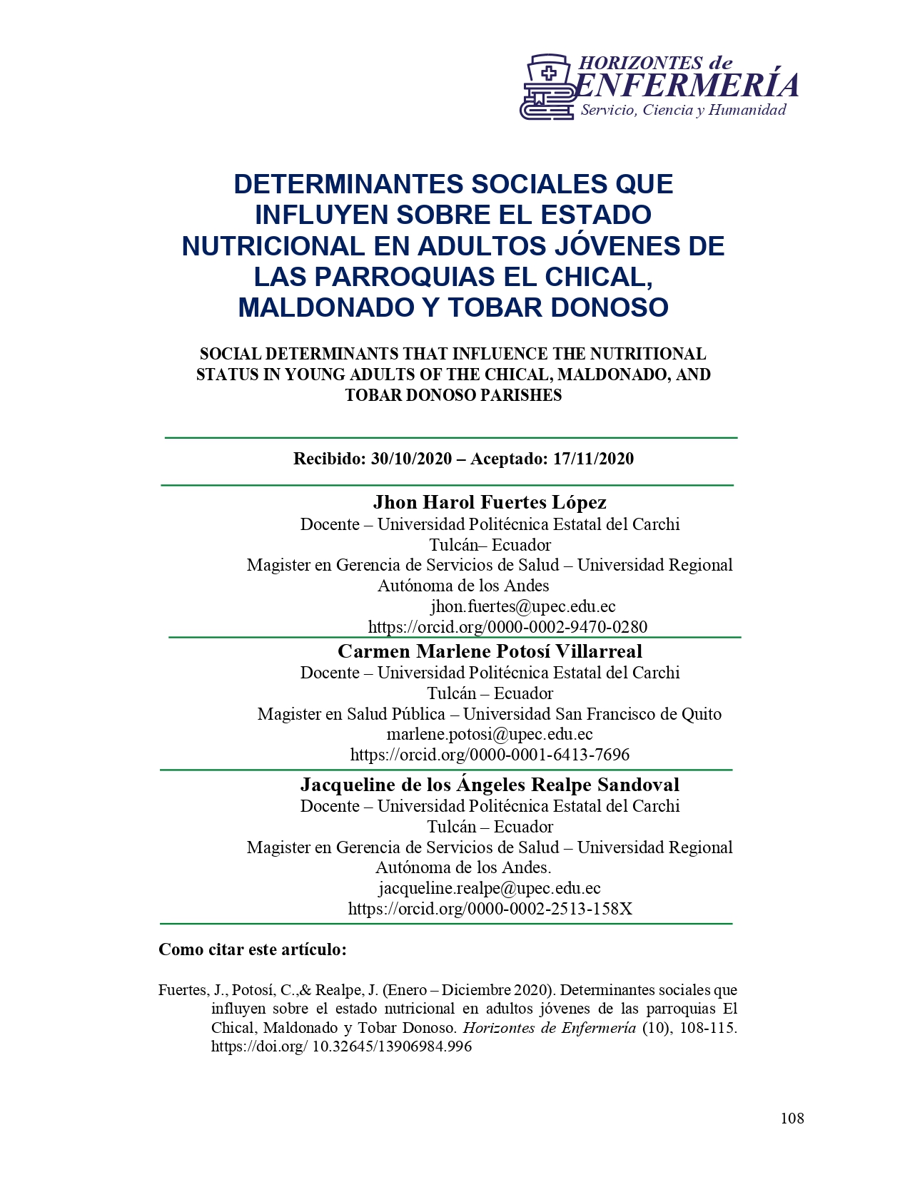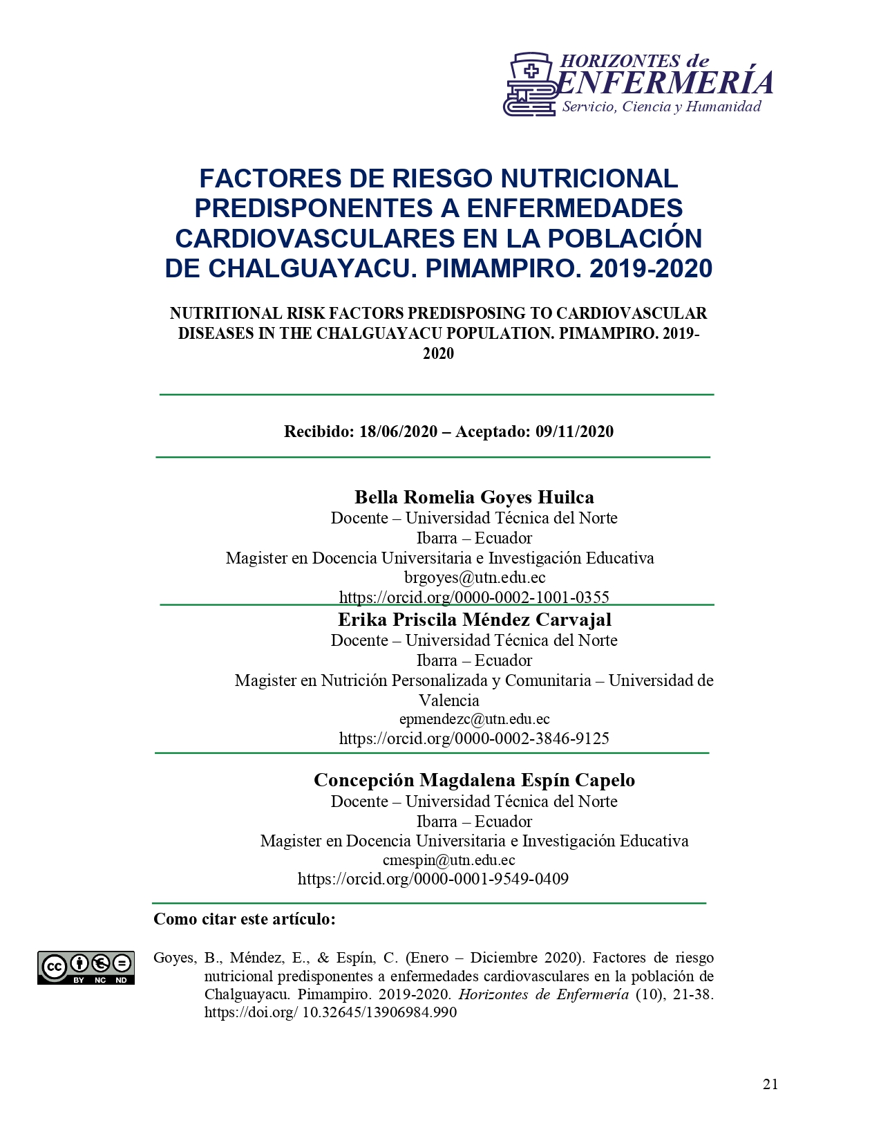 Horizontes de Enfermería publica resultados de investigaciones realizadas por los docentes de la carrera de enfermería, de otras carreras y de profesionales en salud similares, foros, congresos, simposios, seminarios y artículos de vinculación con la colectividad bajo la responsabilidad de sus autores. Los artículos solo pueden ser reproducidos citando la fuente.
