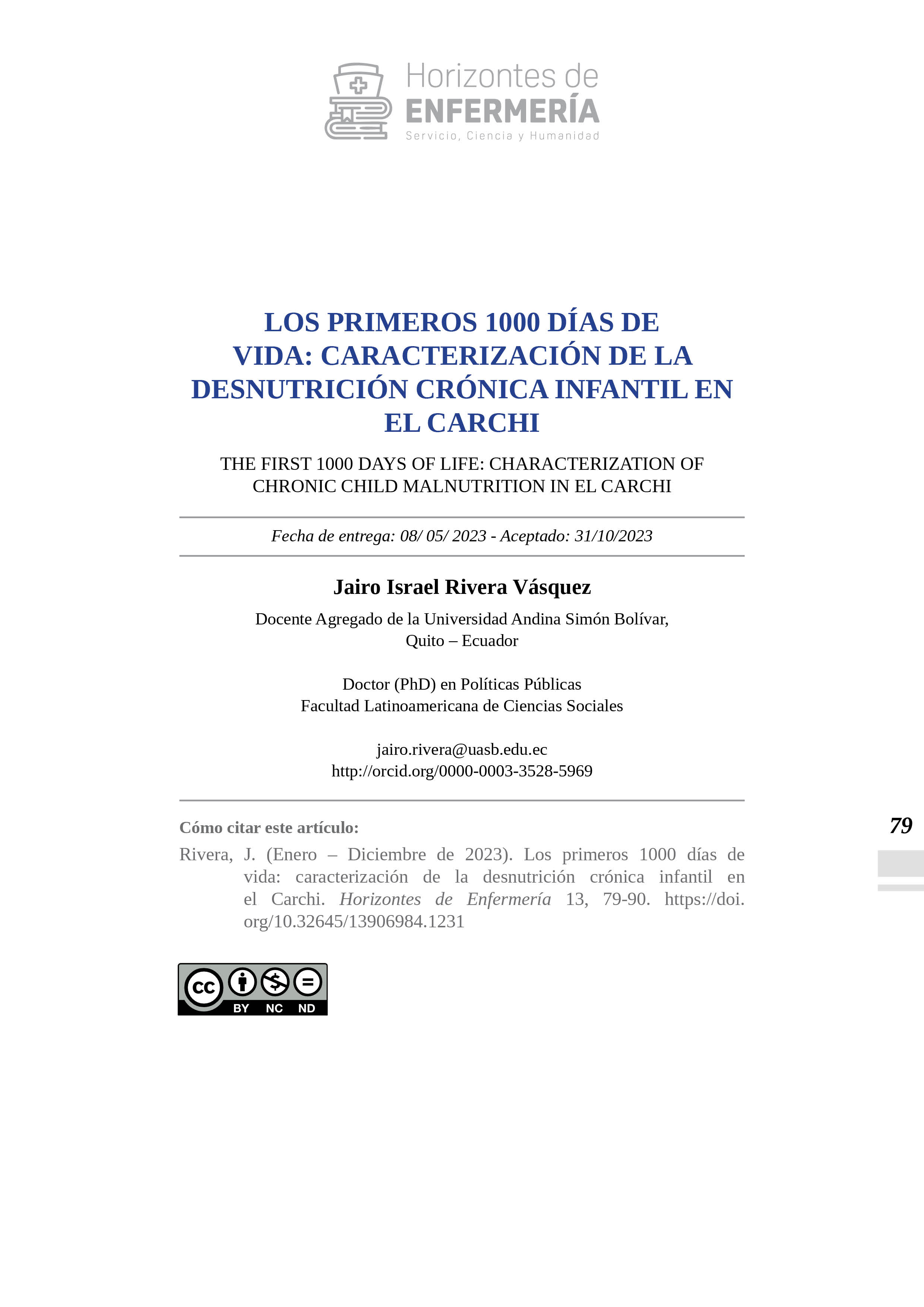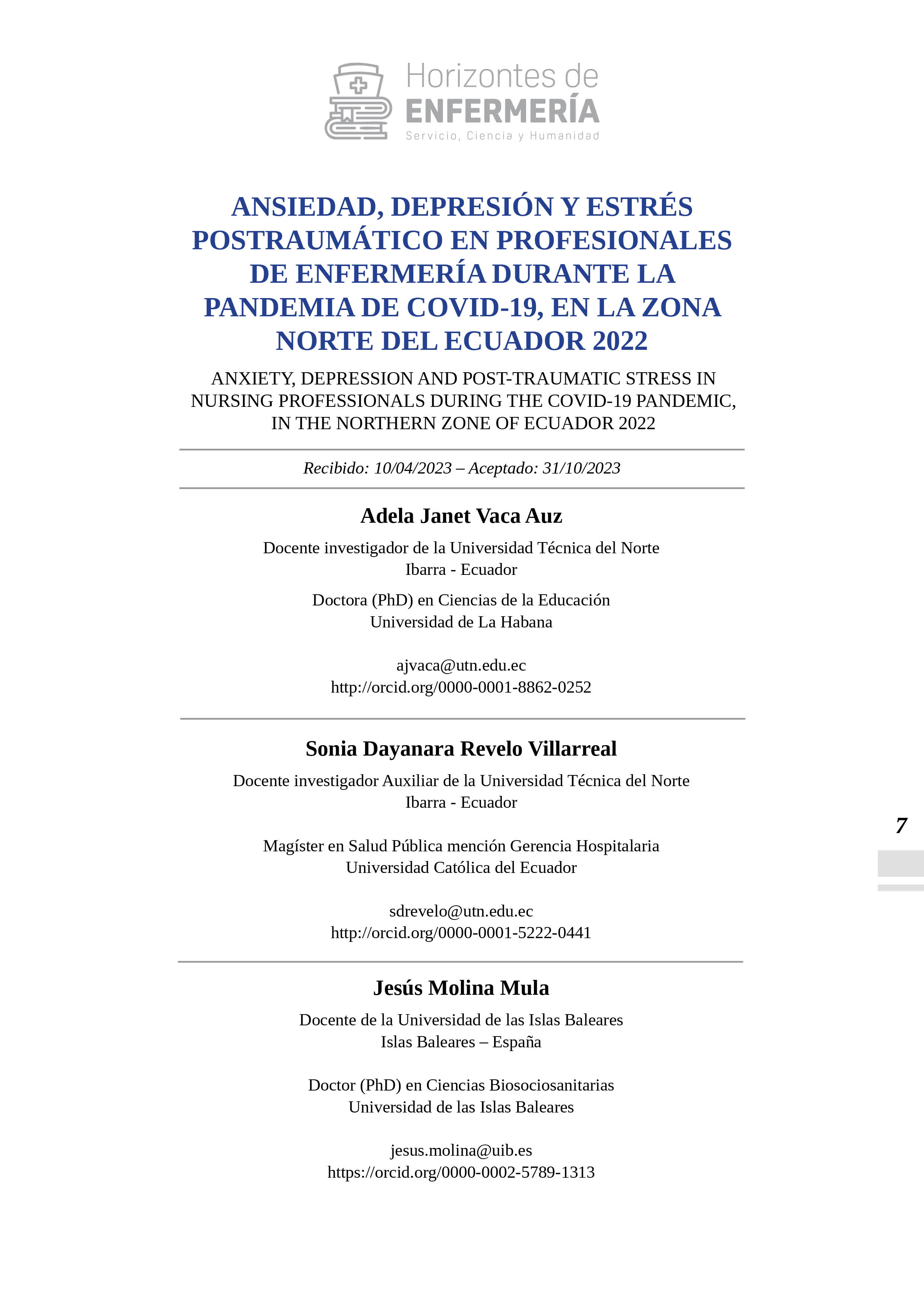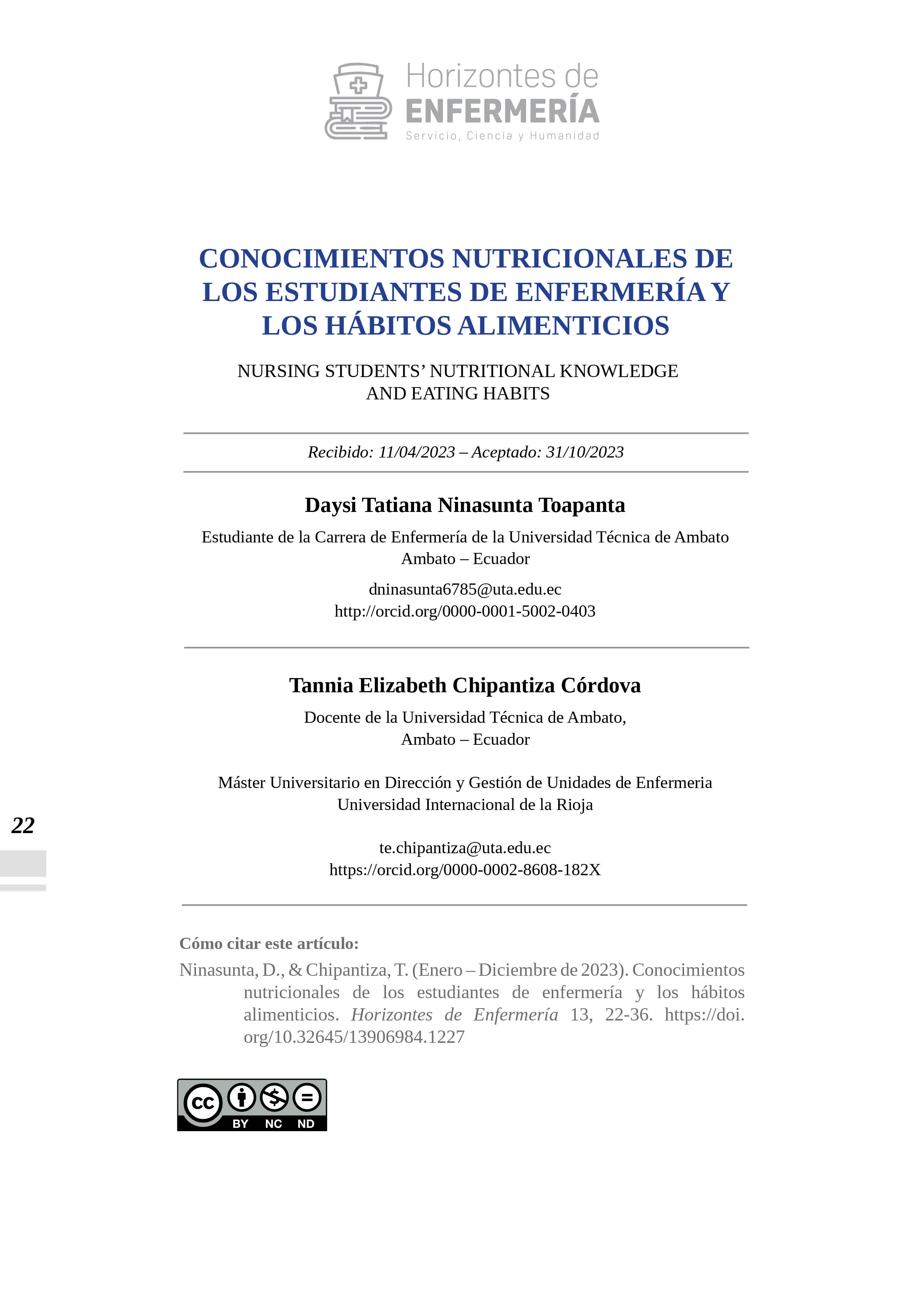 HORIZONTES DE ENFERMERÍA publica resultados de investigaciones realizadas por los docentes de la Carrera de Enfermería, de otras carreras y de profesionales en salud similares, foros, congresos, simposios, seminarios y artículos de vinculación con la colectividad bajo la responsabilidad de sus autores. Los artículos solo pueden ser reproducidos citando la fuente.