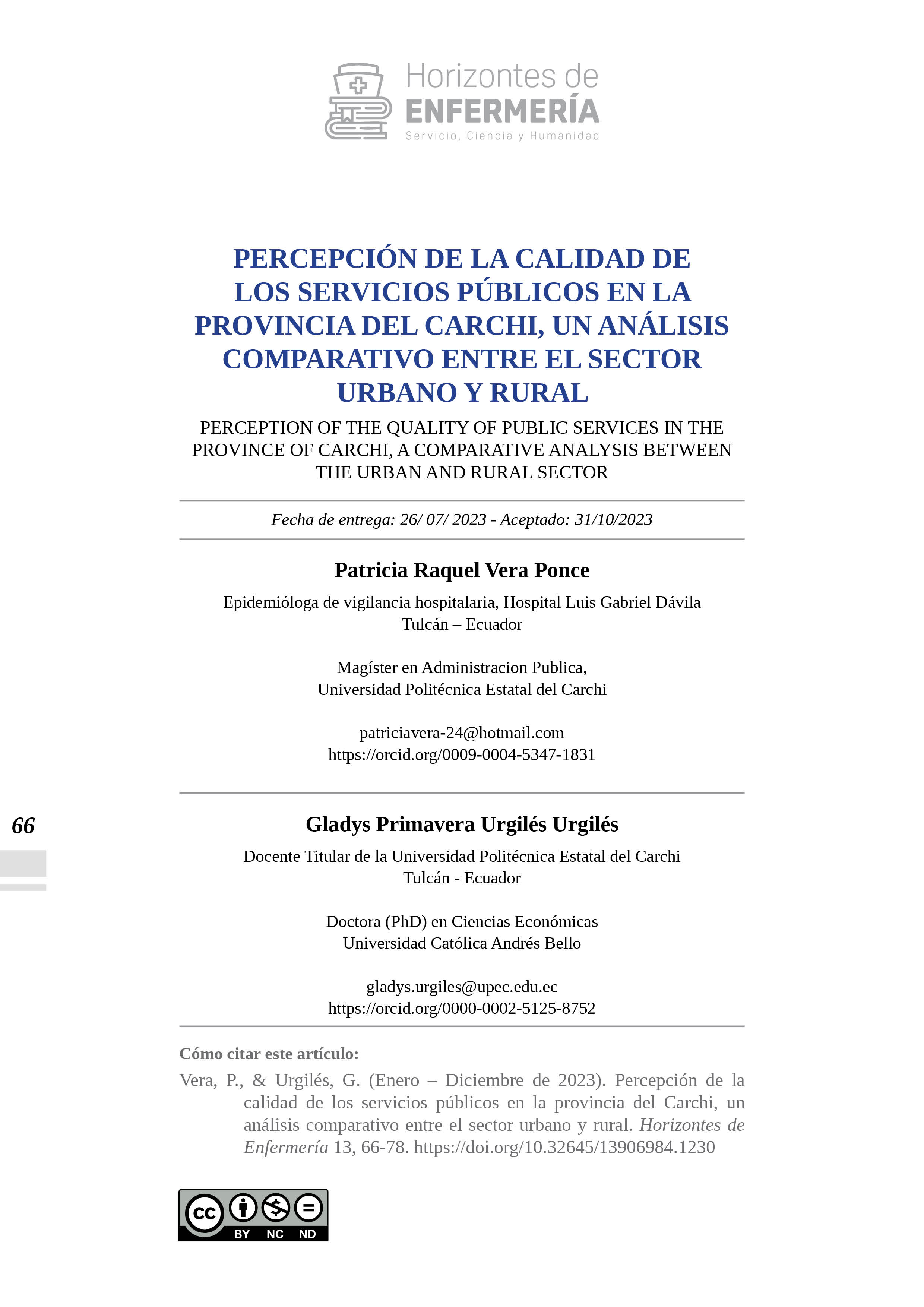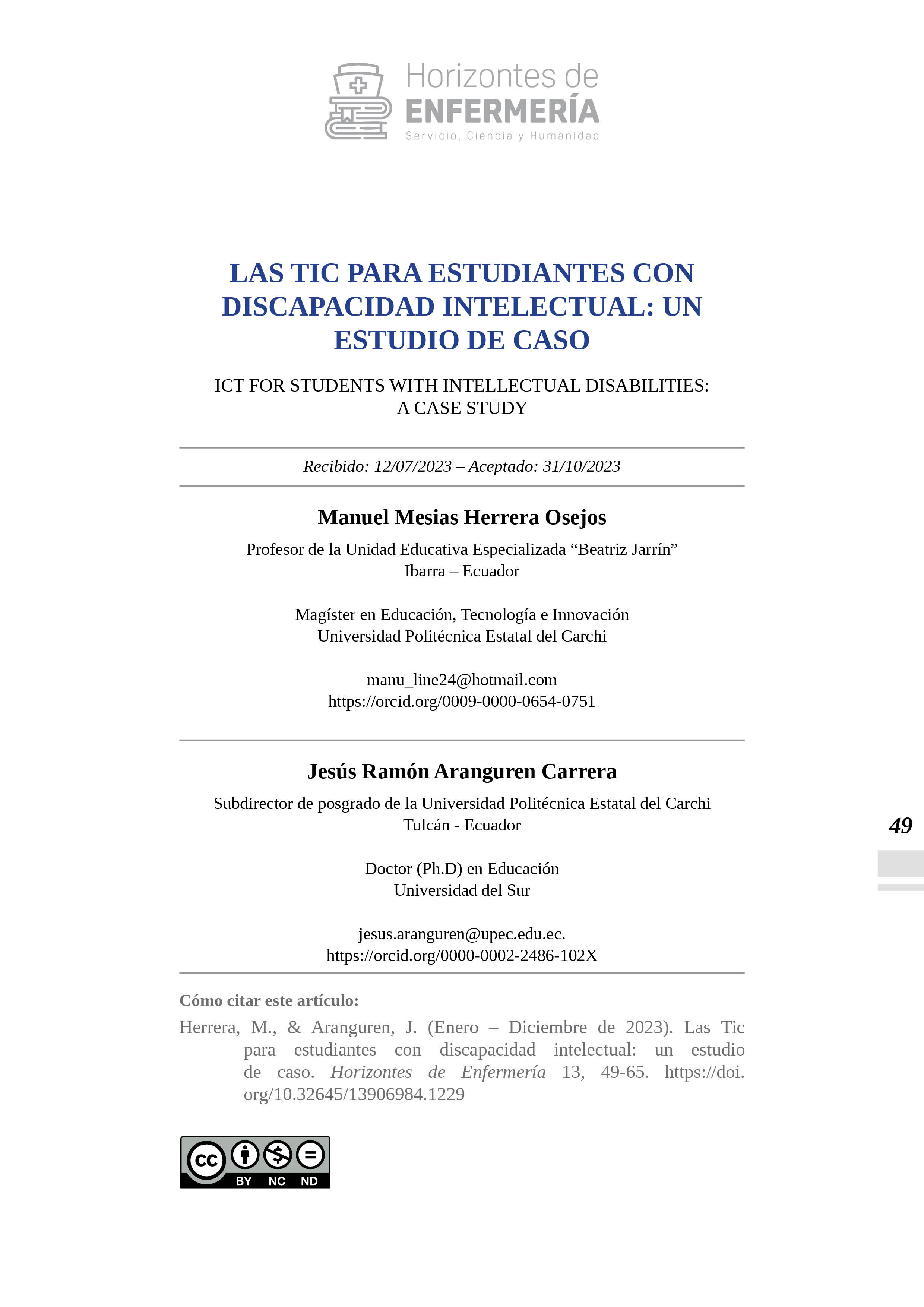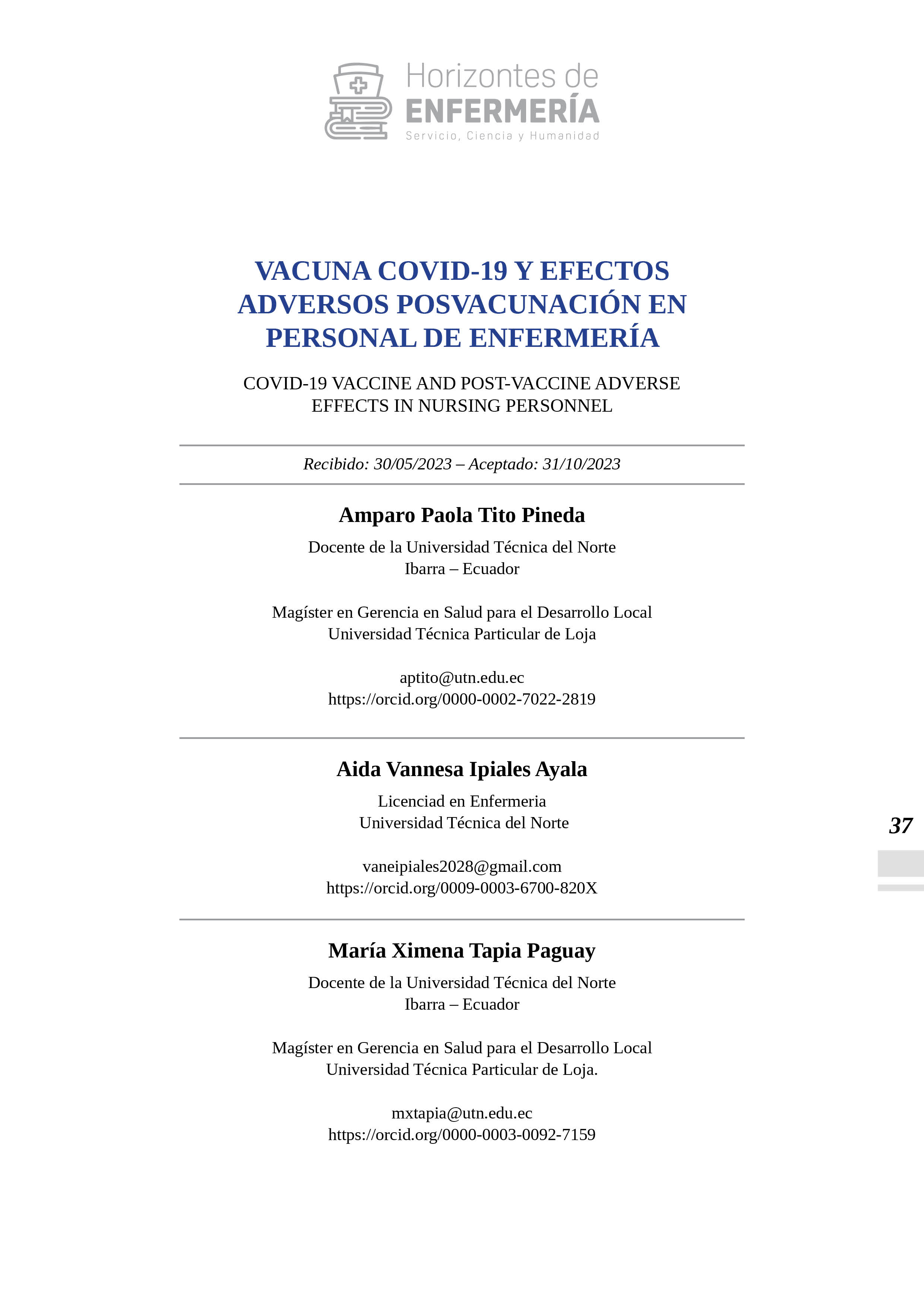 HORIZONTES DE ENFERMERÍA publica resultados de investigaciones realizadas por los docentes de la Carrera de Enfermería, de otras carreras y de profesionales en salud similares, foros, congresos, simposios, seminarios y artículos de vinculación con la colectividad bajo la responsabilidad de sus autores. Los artículos solo pueden ser reproducidos citando la fuente.