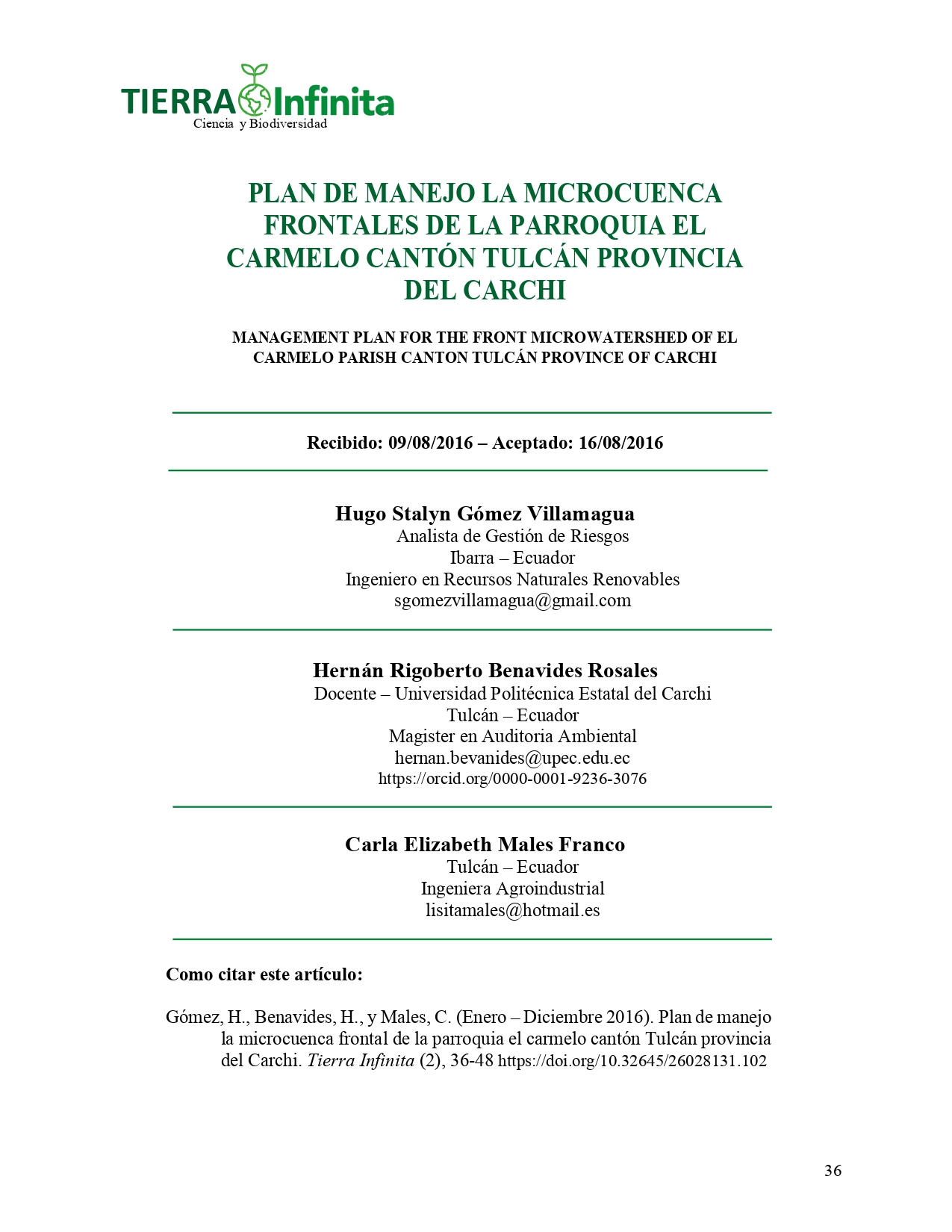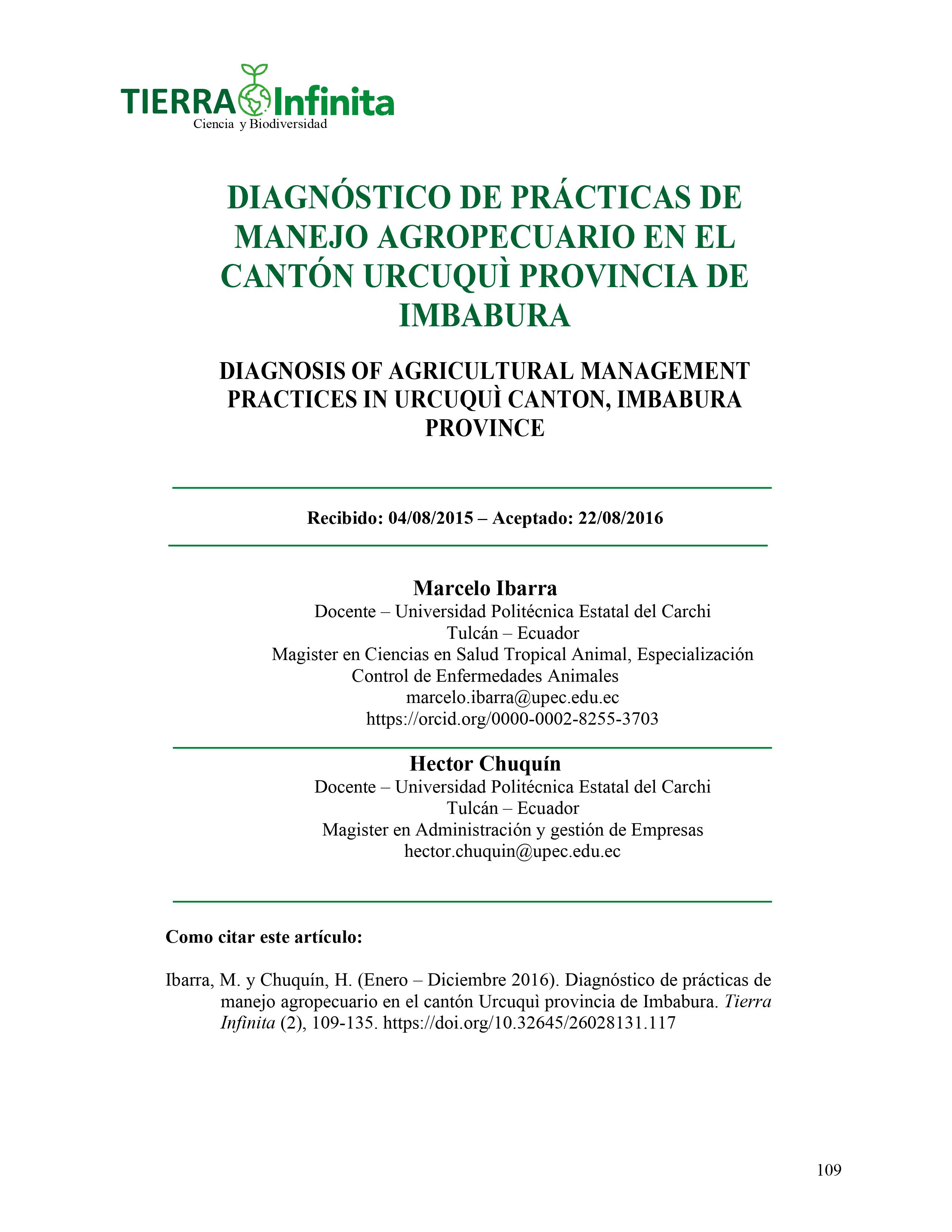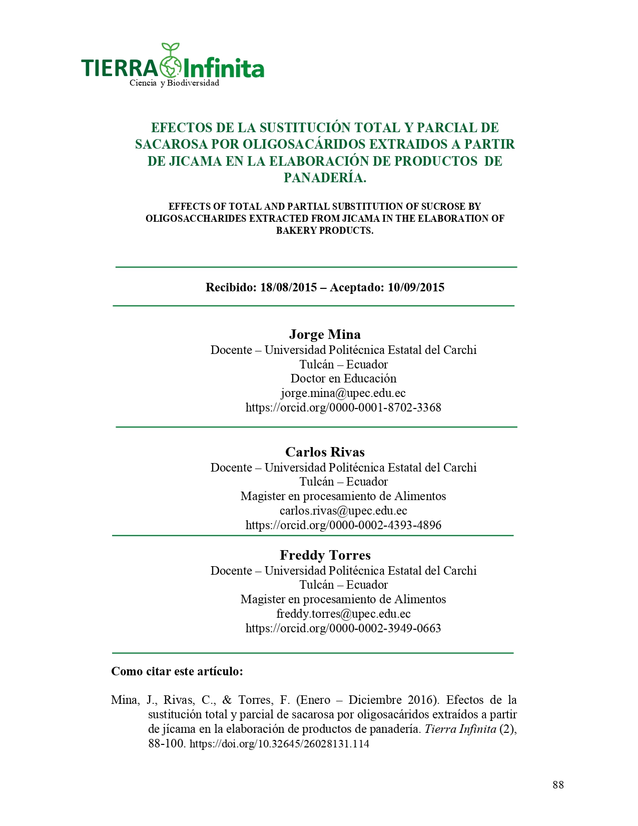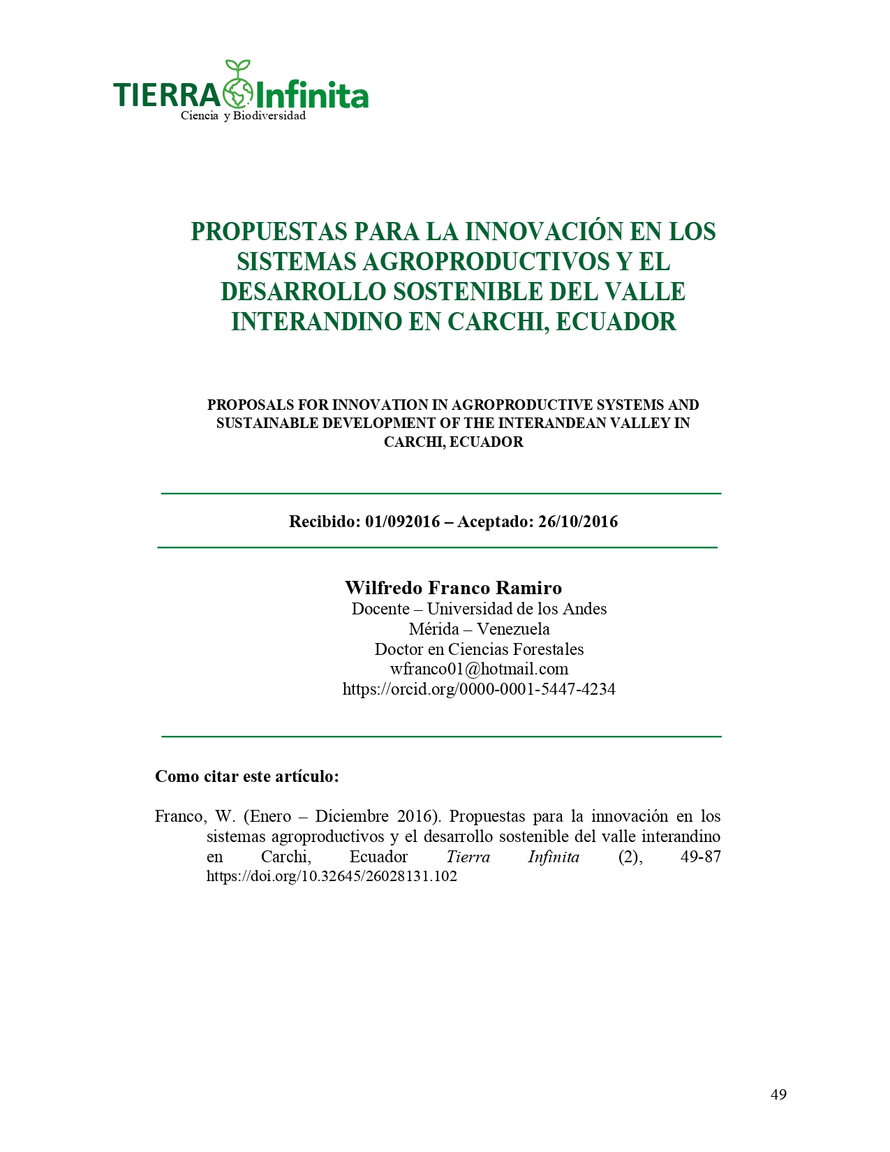 La Revista TIERRA INFINITA, en su segundo número de publicación y como medio informativo científico de la Facultad de Industrias Agropecuarias y Ciencias Ambientales mantiene sus bases de identificación, esto es, la libertad de acción, la apertura a nuevas ideas y contribuciones, el rigor en la evaluación de los contenidos y su carácter cooperativo.