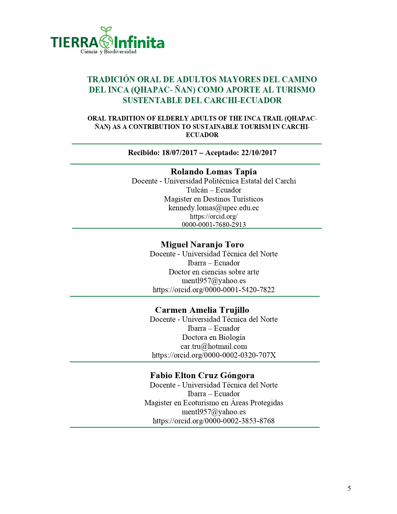 En ese contexto, se presenta un estudio pormenorizado de la tradición oral de adultos mayores del camino del inca (Qhapac- Í‘an) como aporte al turismo sustentable del Carchi-Ecuador, rediseño de infraestructura turística, la actividad Turística como entorno para senderar la paz, los oficios tradicionales del cantón Montúfar y el turismo cultural, la empresa familiar: factores extrínsecos e intrínsecos que la limitan, manejo de los Bienes Muebles Culturales de la Virgen de la Purificación de Huaca, Framework en estructuras con direccionamiento ipv6 sobre osstmml luces y sombras para la corrección de vulnerabilidades de seguridad, Uso de las TIC en la formación infantil, emprendimiento tecnológico: proveedor de Servicios de Internet Inalámbrico (WISP), tradición oral de los saberes de Maldonado, los mismo que están presentes para que los investigadores apoyen con sus citas a las propuestas planteadas.