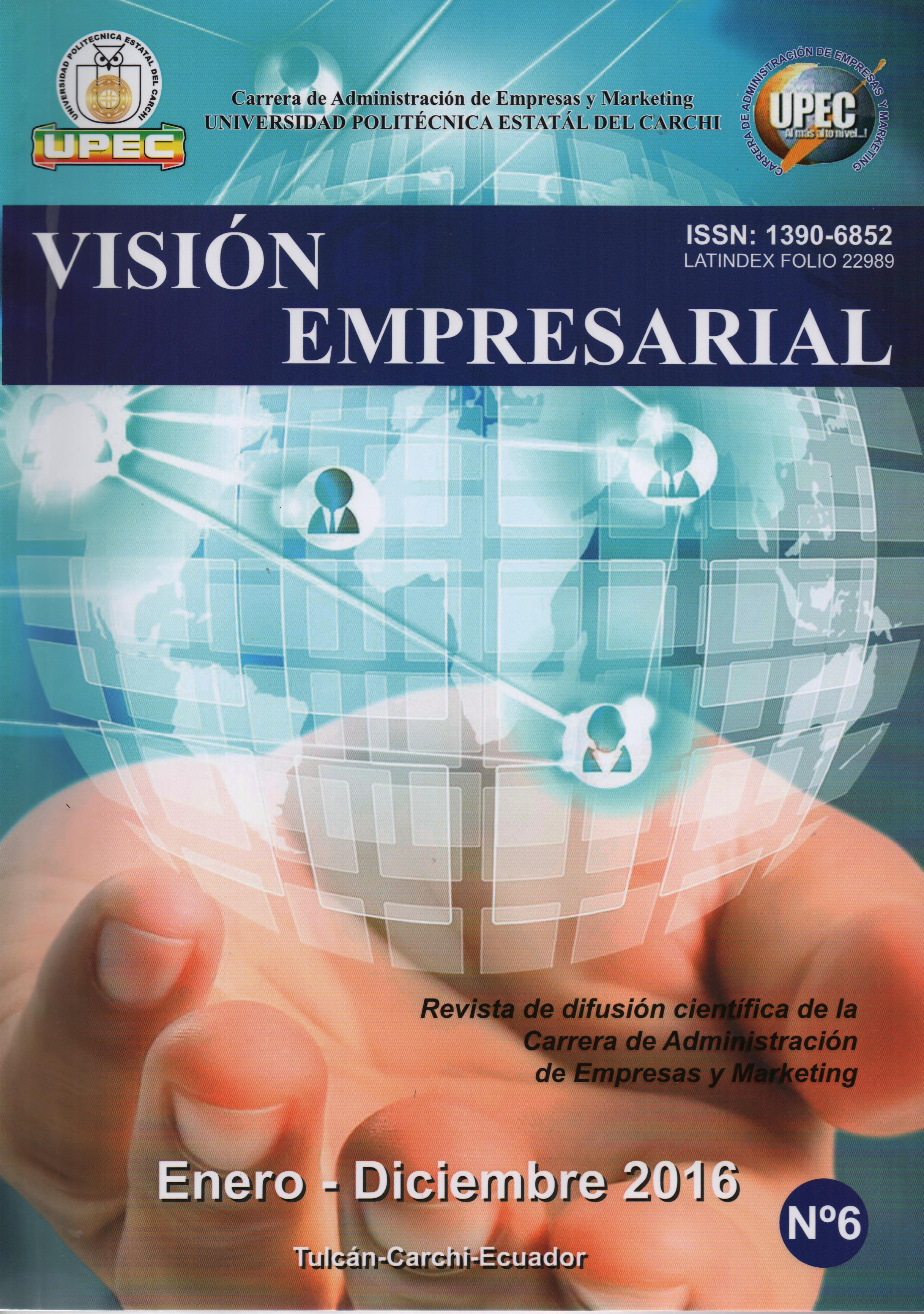 Núm. 6 (2016)Visión Empresarial publica artículos científicos, estudios de casos, reseñas de libros, memorias de eventos académicos, resultados de transferencia tecnológica y ensayos elaborados por docentes o estudiantes de la UPEC o de universidades o centros de investigación a nivel nacional. Todo lo descrito en cada artículo es responsabilidad única y exclusividad de su autor. Está publicación está dirigida a todo el público que se encuentre interesado en conocer a fondo temas relacionados con: Administración de Empresas, Adminitración Pública, Comercio Exterior, Logística y Transporte.
