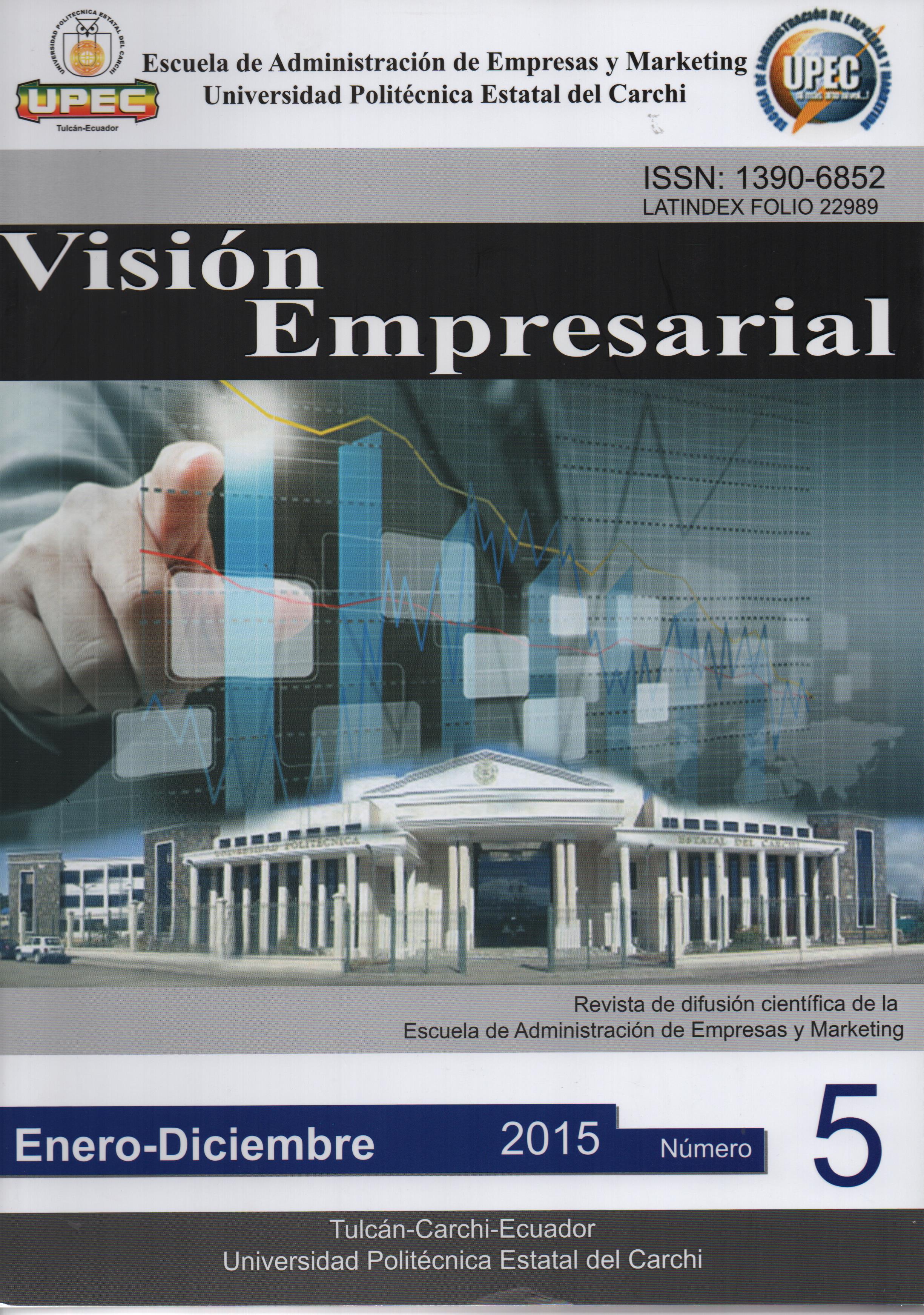 Núm. 5 (2015)Visión Empresarial publica artículos científicos, estudios de casos, reseñas de libros, memorias de eventos académicos, resultados de transferencia tecnológica y ensayos elaborados por docentes o estudiantes de la UPEC o de universidades o centros de investigación a nivel nacional. Todo lo descrito en cada artículo es responsabilidad única y exclusividad de su autor. Está publicación está dirigida a todo el público que se encuentre interesado en conocer a fondo temas relacionados con: Administración de Empresas, Adminitración Pública, Comercio Exterior, Logística y Transporte.