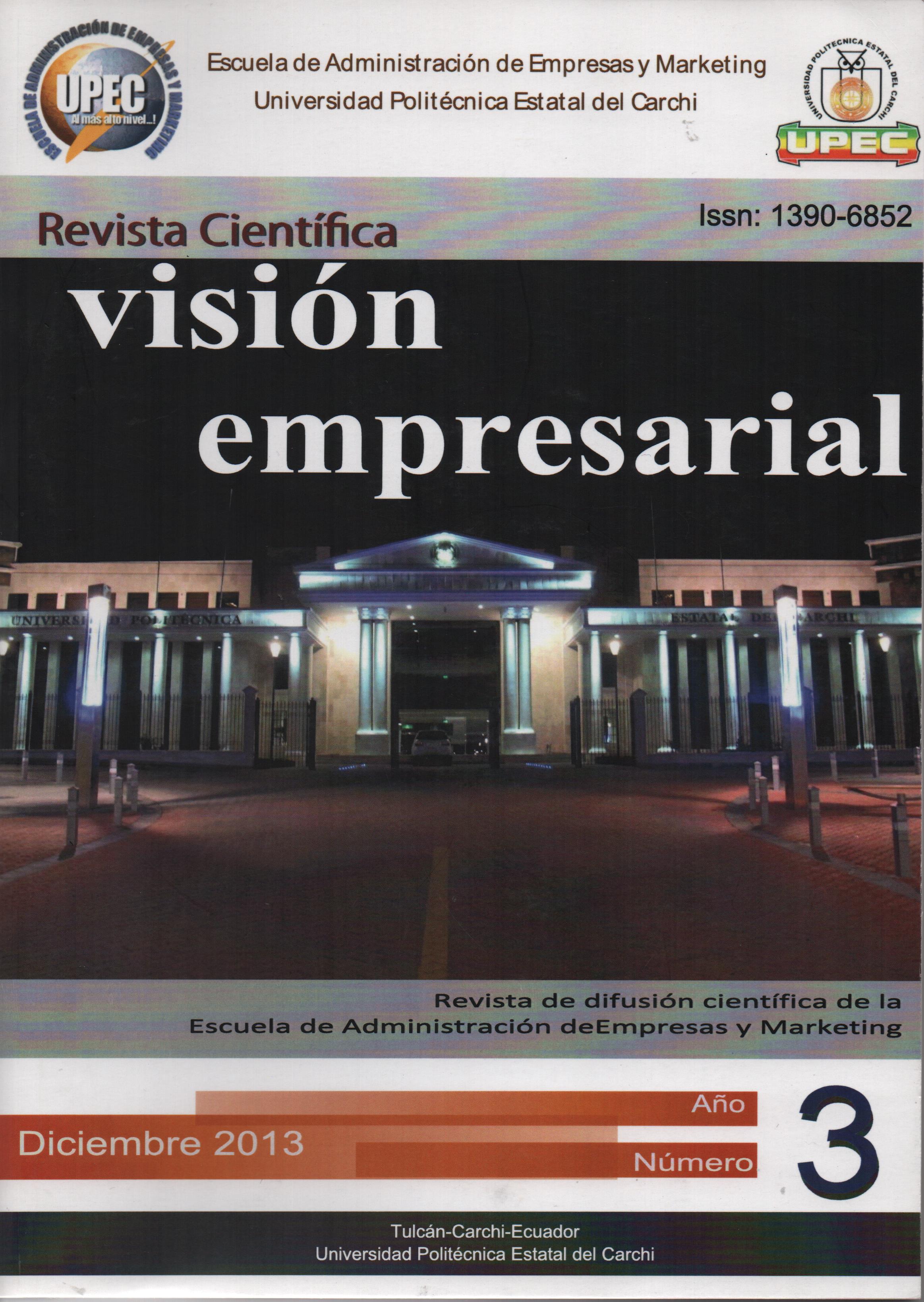Núm. 3 (2013)Visión Empresarial publica artículos científicos, estudios de casos, reseñas de libros, memorias de eventos académicos, resultados de transferencia tecnológica y ensayos elaborados por docentes o estudiantes de la UPEC o de universidades o centros de investigación a nivel nacional. Todo lo descrito en cada artículo es responsabilidad única y exclusividad de su autor. Está publicación está dirigida a todo el público que se encuentre interesado en conocer a fondo temas relacionados con: Administración de Empresas, Adminitración Pública, Comercio Exterior, Logística y Transporte.