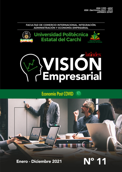 Núm. 11 (2021)Visión Empresarial.- volumen 11, período enero – diciembre 2021. Es una revista de la Facultad de Comercio Internacional, Integración, Administración y Economía Empresarial, administrada por la Carrera de Administración de Empresas cuyo objetivo es la difusión del conocimiento mediante la publicación de ensayos, estudios de caso, memorias de eventos académicos, artículos de investigación, resultados de transferencia tecnológica elaborados por investigadores de universidades o centros de investigación a nivel nacional o internacional. Todo lo descrito en cada artículo es responsabilidad única y exclusividad de su autor. Está publicación está dirigida a todo el público que se encuentre interesado en conocer a fondo temas relacionados con: Administración de Empresas, Administración Pública, Comercio Exterior, Logística y Transporte y afines.