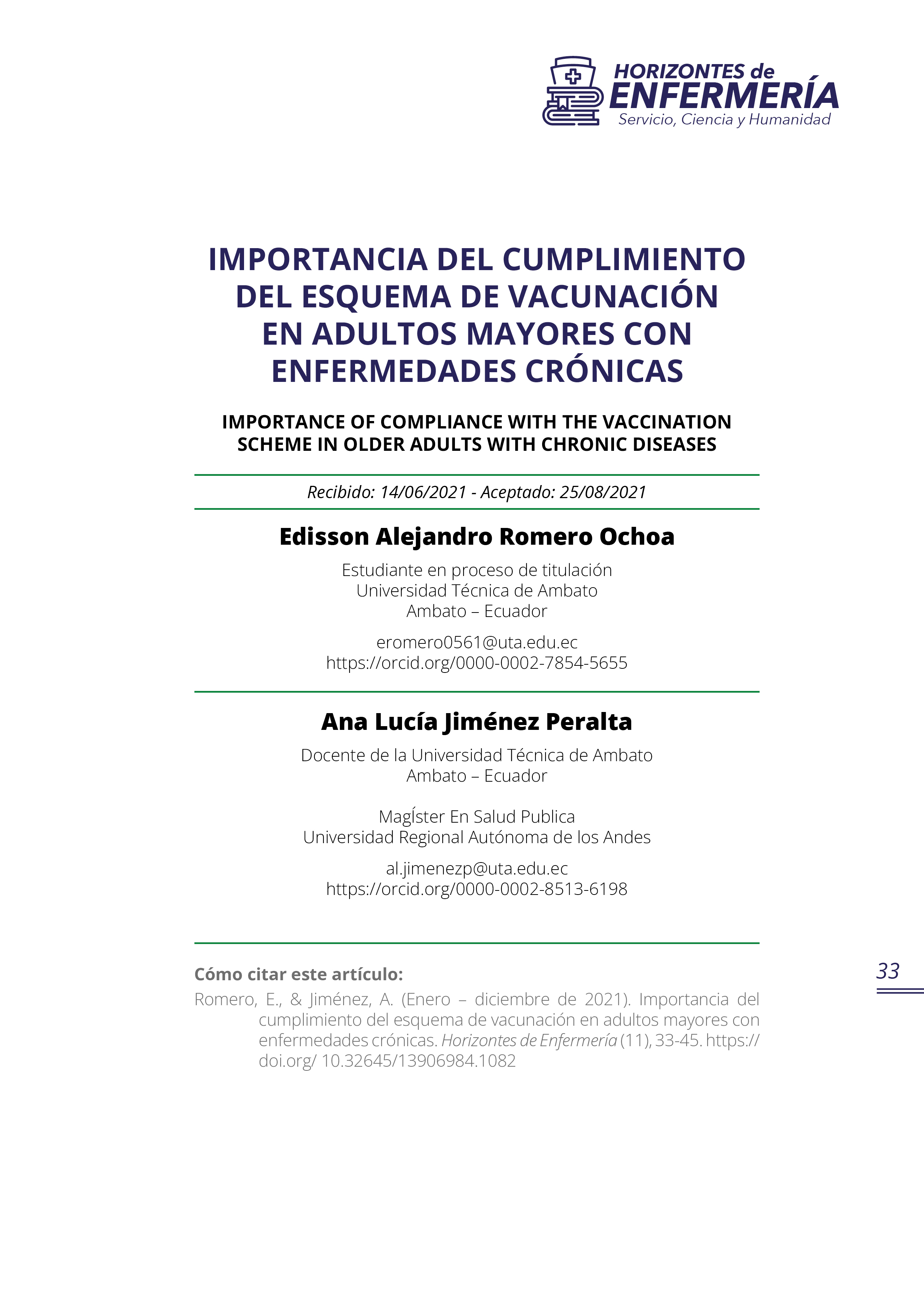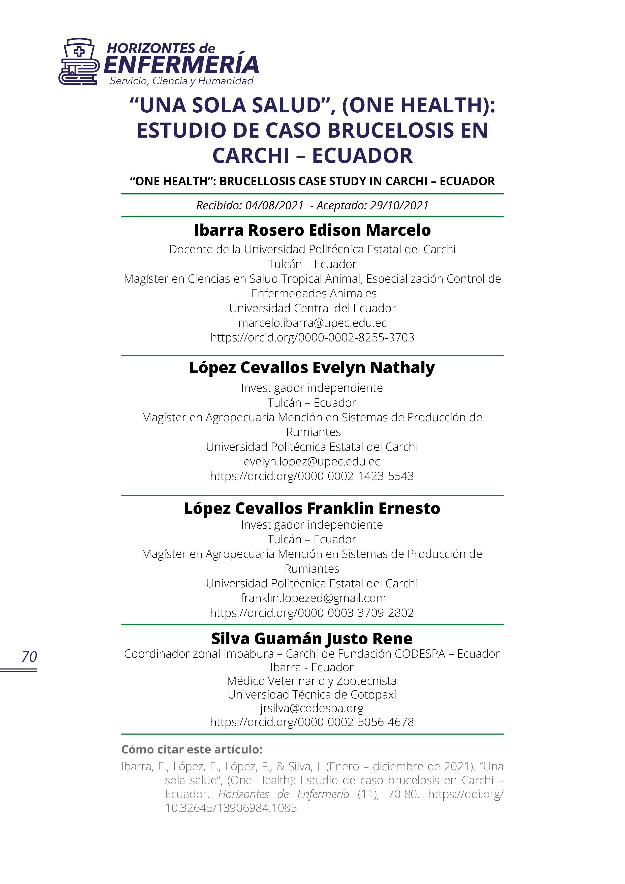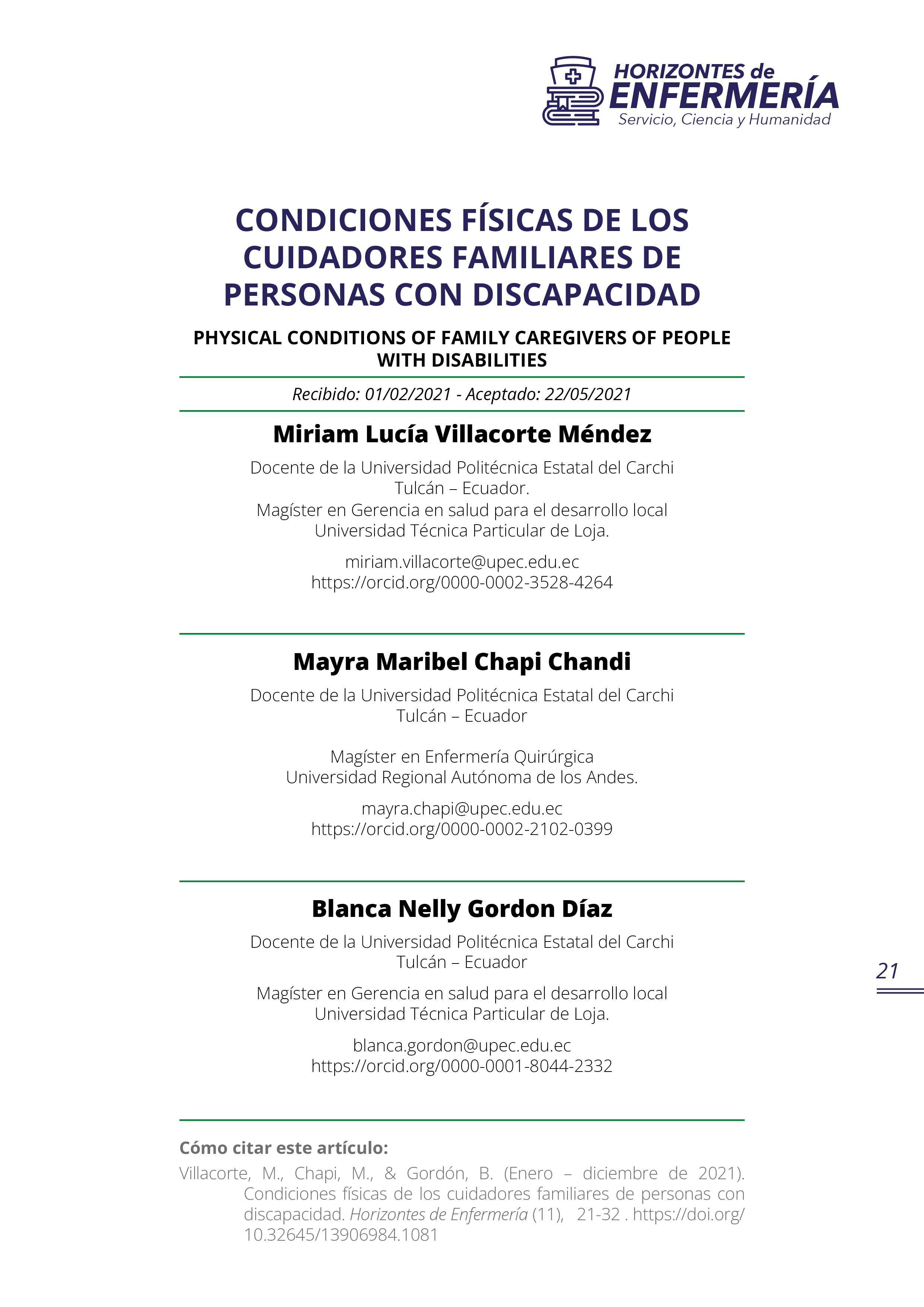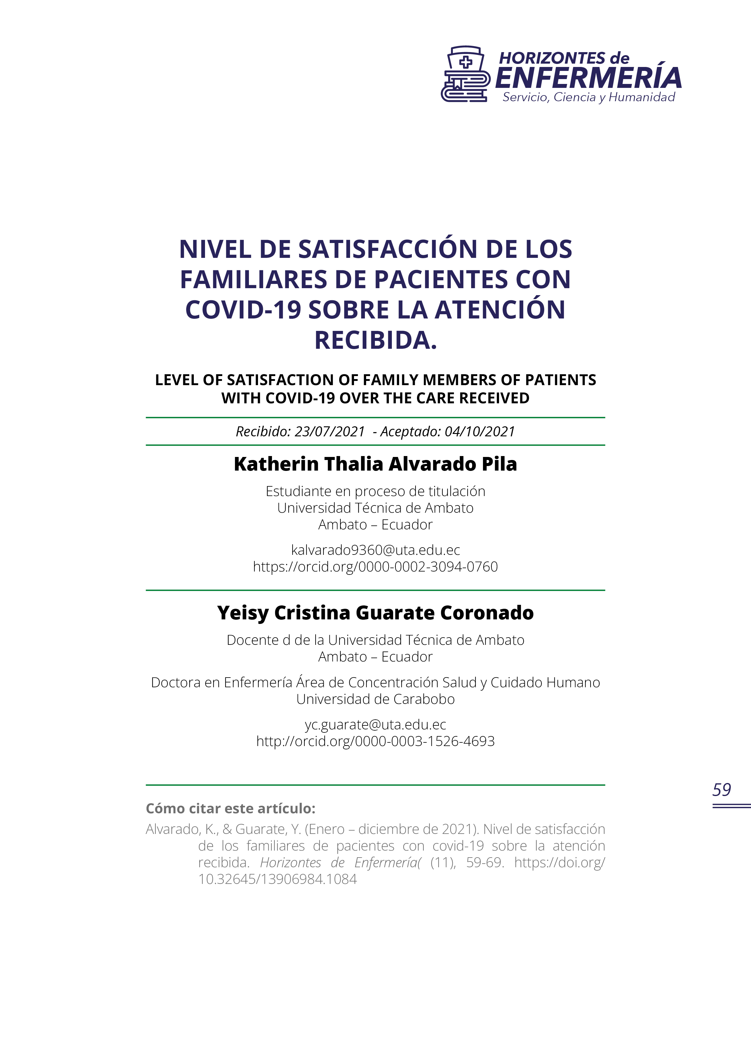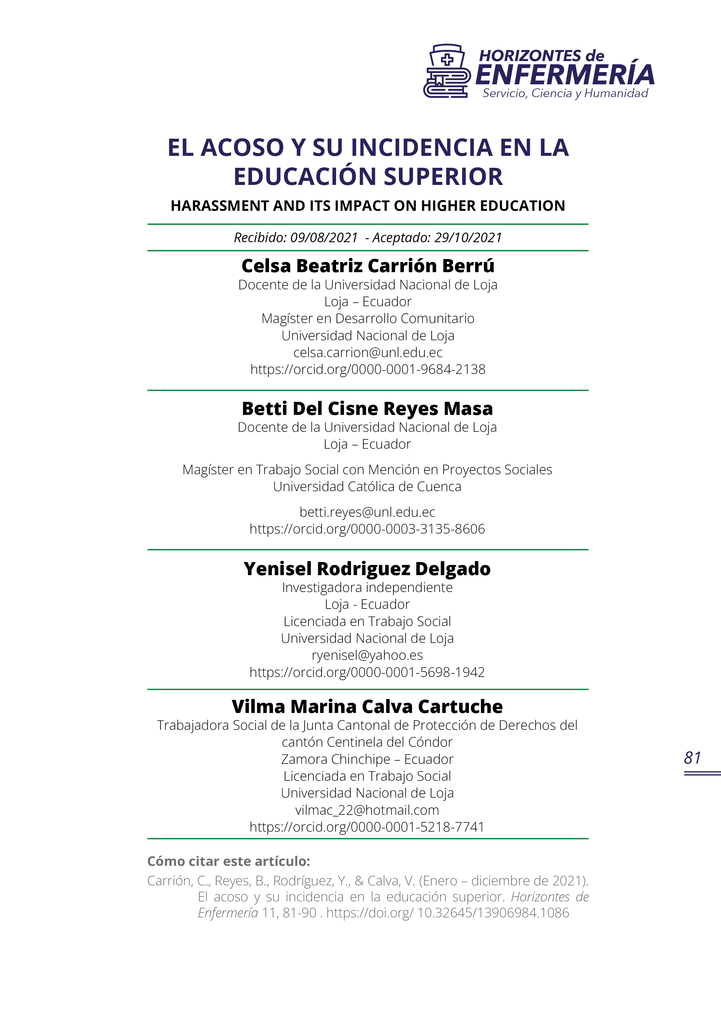 Horizontes de Enfermería publica resultados de investigaciones realizadas por los docentes de la carrera de enfermería, de otras carreras y de profesionales en salud similares, foros, congresos, simposios, seminarios y artículos de vinculación con la colectividad bajo la responsabilidad de sus autores. Los artículos solo pueden ser reproducidos citando la fuente.