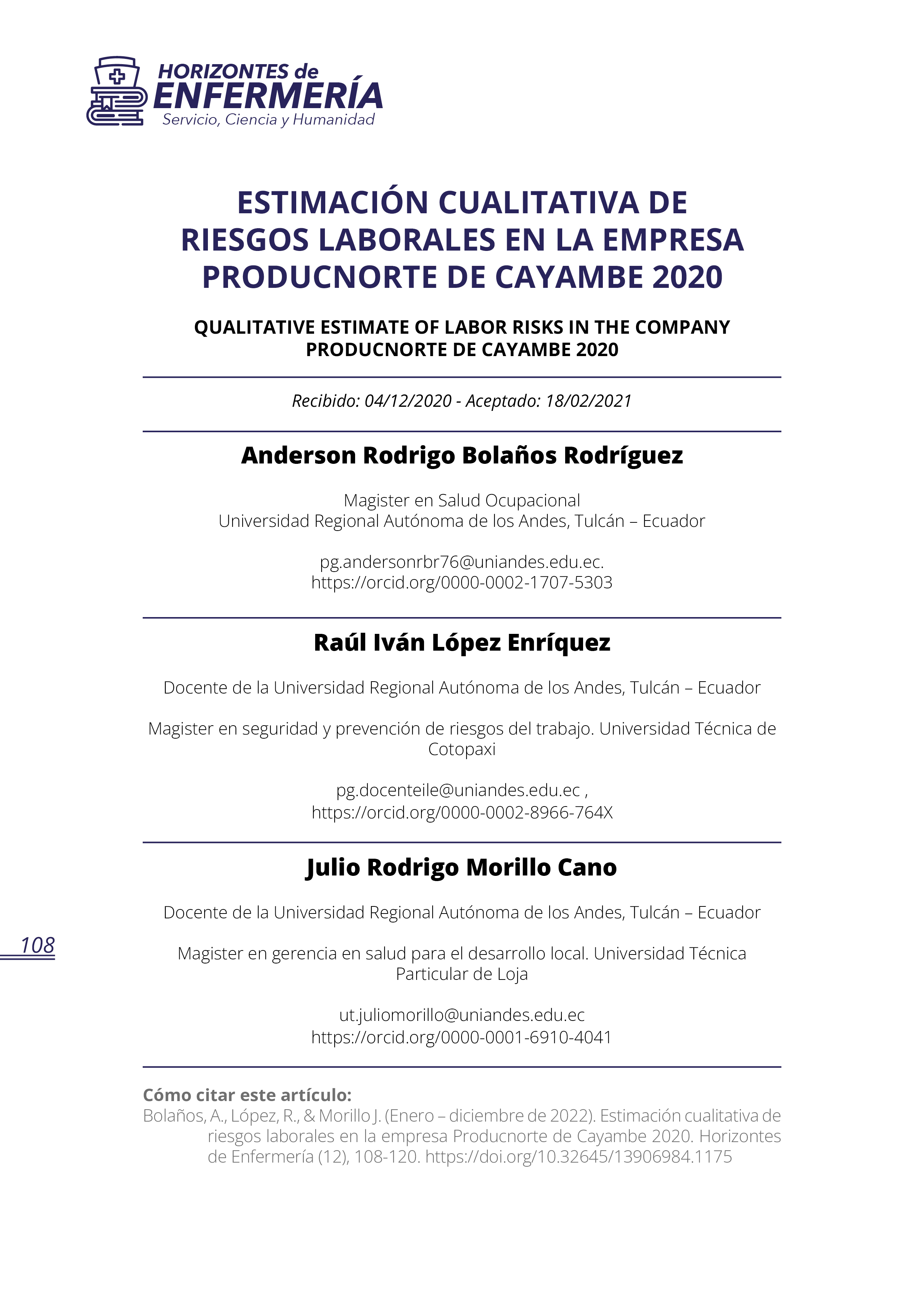 Horizontes de Enfermería publica resultados de investigaciones realizadas por los docentes de la carrera de enfermería, de otras carreras y de profesionales en salud similares, foros, congresos, simposios, seminarios y artículos de vinculación con la colectividad bajo la responsabilidad de sus autores. Los artículos solo pueden ser reproducidos citando la fuente.